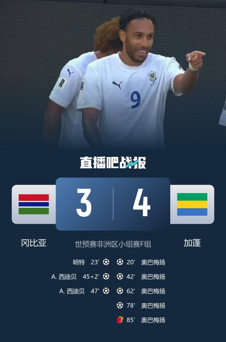 在10月10日的世界预选赛非洲区F组第9轮比赛中,加蓬队在客场以4-3击败冈比亚,展现了非凡的拼搏精神。年届36的加蓬前锋奥巴梅扬,犹如凌空破空的雄鹰,在这场对决中大放异彩,上演了惊人的四粒进球,凭一己之力为球队争取了这场至关重要的胜利。